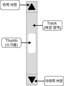 감소 버튼(Decrement) : 스크롤바의 상단에 위치한 버튼으로 클릭 시 콘텐츠가 위쪽으로 스크롤됩니다.