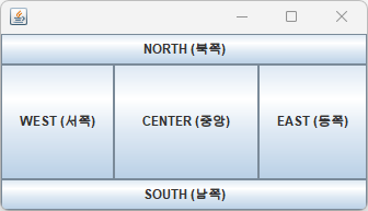 BorderLayout은 컴포넌트를 동(EAST), 서(WEST), 남(SOUTH), 북(NORTH), 중앙(CENTER) 다섯 개의 영역에 배치하는 레이아웃입니다.